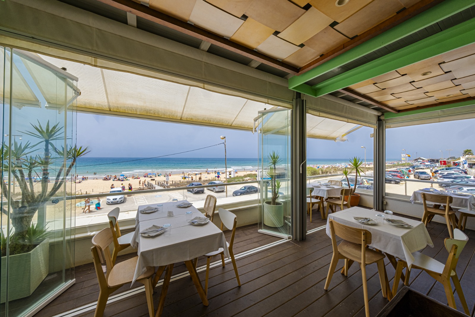 El local cuenta con un agradable comedor acristalado con vistas a la playa de El Palmar. Esta estampa todavía es más impresionante si subimos a la azotea que tienen acondicionada con 8 mesas más y que ofrecen una panorámica perfecta de la costa.