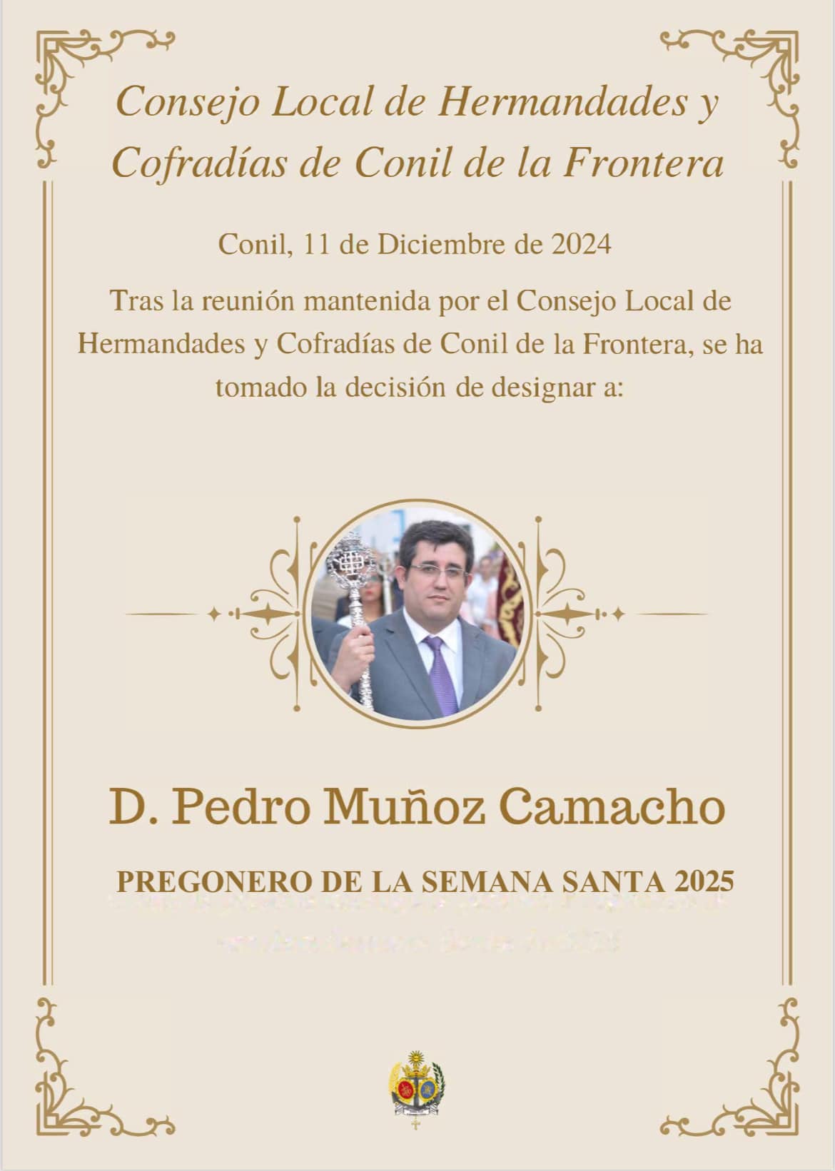 El Consejo Local de Hermandades y Cofradías de Conil ha anunciado que Pedro Muñoz Camacho, anterior Hermano Mayor de la Hermandad del Nazareno de Conil, será el encargado de pronunciar el pregón de la Semana Santa 2025. La designación fue comunicada con entusiasmo a través de un mensaje que resalta las cualidades humanas y cofrades del elegido.