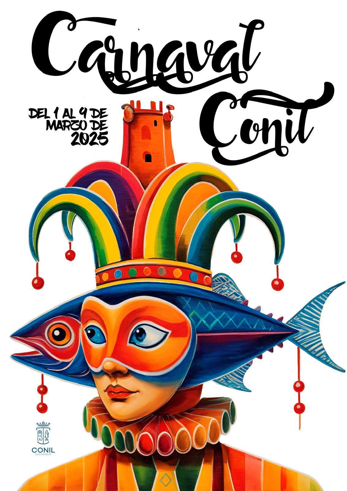 La Delegación de Fiestas del Ayuntamiento de Conil ha presentado el cartel oficial del Carnaval 2025, una obra del artista riojano José Ángel Ligero Martínez. La imagen, que ha sido elegida por el Consejo del Carnaval, refleja la esencia festiva de estas celebraciones a través de un colorido arlequín, acompañado de símbolos identitarios del municipio como la Torre de Guzmán y un antifaz con forma de atún.