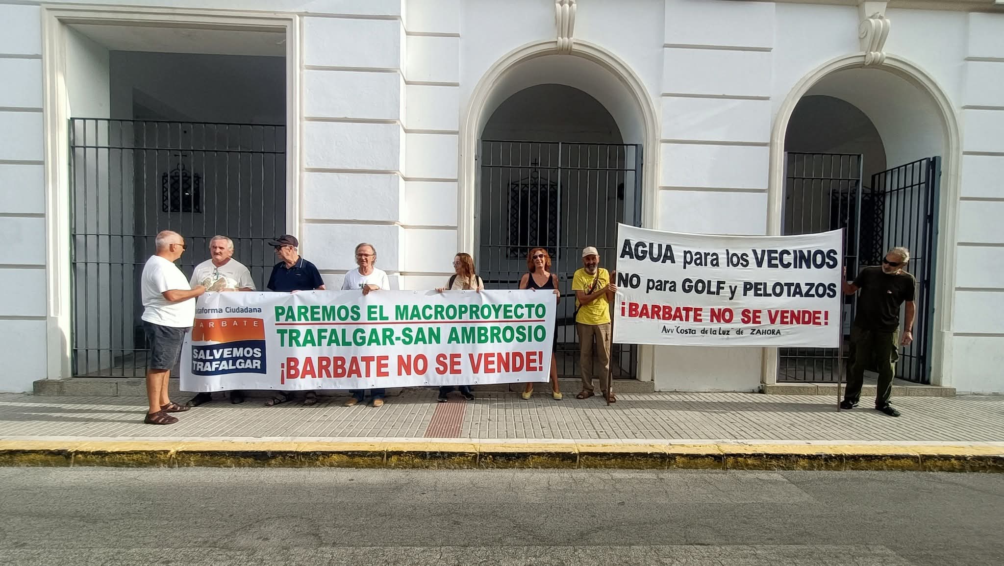 Durante el Pleno, un numeroso grupo de miembros de la Plataforma Ciudadana Salvemos Trafalgar se hizo presente en el salón de sesiones y en las inmediaciones del Ayuntamiento para manifestar su rechazo al proyecto, portando pancartas con lemas como “Agua para los vecinos y no para el golf y los pelotazos”. Denuncian que mientras muchas pedanías del municipio siguen sin agua potable ni servicios básicos, el consistorio apuesta por desarrollos urbanísticos de carácter elitista y con un fuerte impacto ambiental.