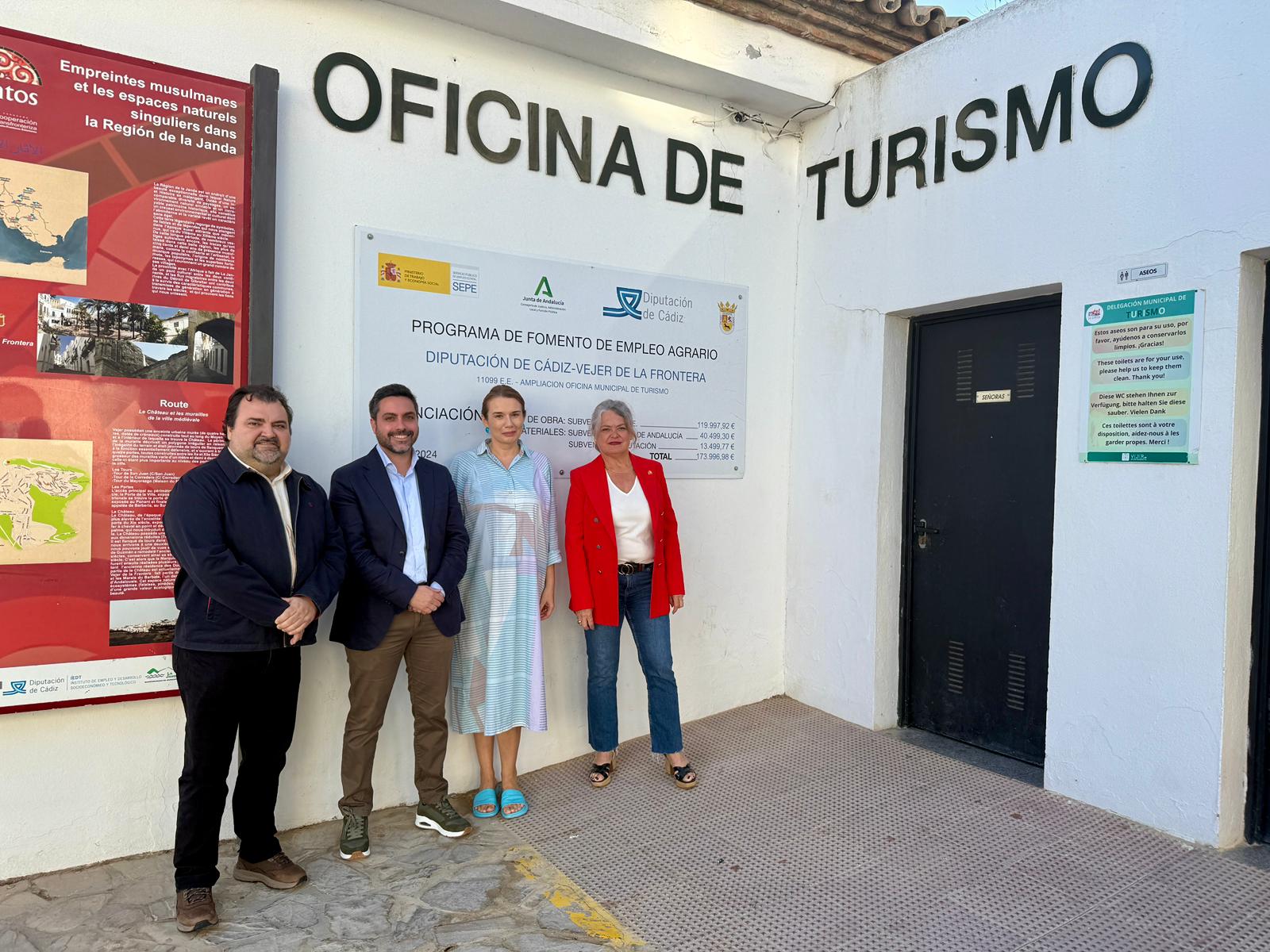 La subdelegada del Gobierno de España en Cádiz, Blanca Flores, ha visitado junto al alcalde de Vejer, Antonio González, las obras de mejora que se están llevando a cabo en el edificio que alberga la Oficina Municipal de Turismo, dentro del Programa de Fomento de Empleo Agrario (PFEA) 2024. En el recorrido también participaron la concejala de Turismo, Dominika Paradiso, y el concejal de Seguridad, Francisco Javier González.