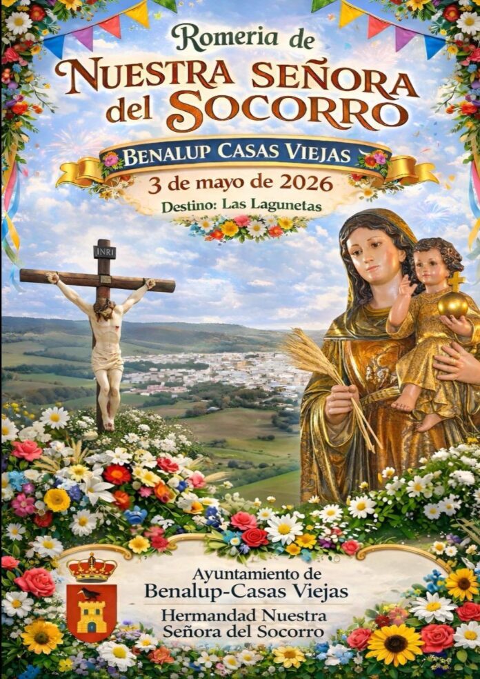 La Delegación de Fiestas del Ayuntamiento de Benalup-Casas Viejas y la Hermandad de Nuestra Señora del Socorro han dado a conocer el programa oficial de la Romería en honor a la Virgen del Socorro hacia Las Lagunetas 2026, cuya jornada principal se celebrará el domingo 3 de mayo.