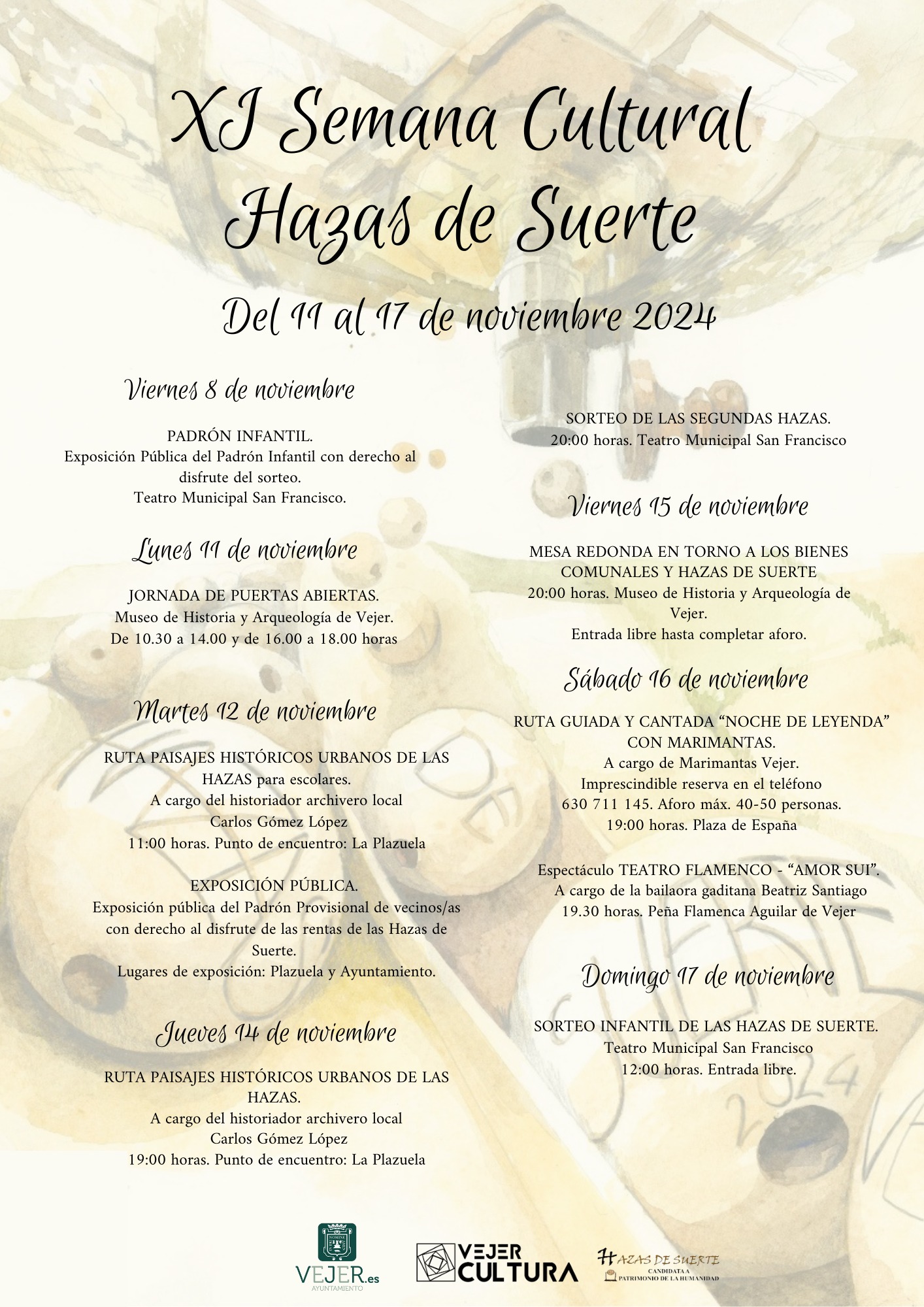 El sábado 16 de noviembre, tendrá lugar una visita guiada y cantada a cargo de Marimantas Vejer, cuya reserva es imprescindible en el teléfono 630 711 145. Además, coincidiendo con el Día Internacional del Flamenco, se ha organizado, en colaboración con la Peña Cultural Flamenca ‘Aguilar de Vejer’, el espectáculo de Teatro Flamenco «Amor Sui».