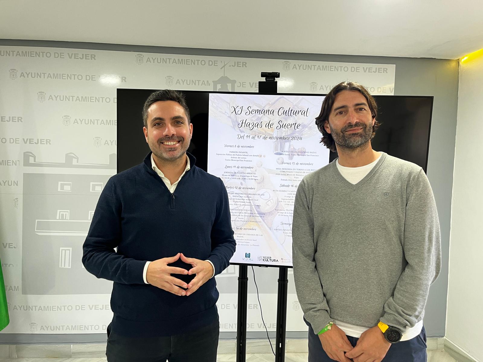 El delegado de Cultura del Ayuntamiento de Vejer, Manuel Jesús Melero, junto al alcalde, Antonio González, ha dado a conocer la programación de la XI Semana de las Hazas de Suerte, que se celebrará del 11 al 17 de noviembre.