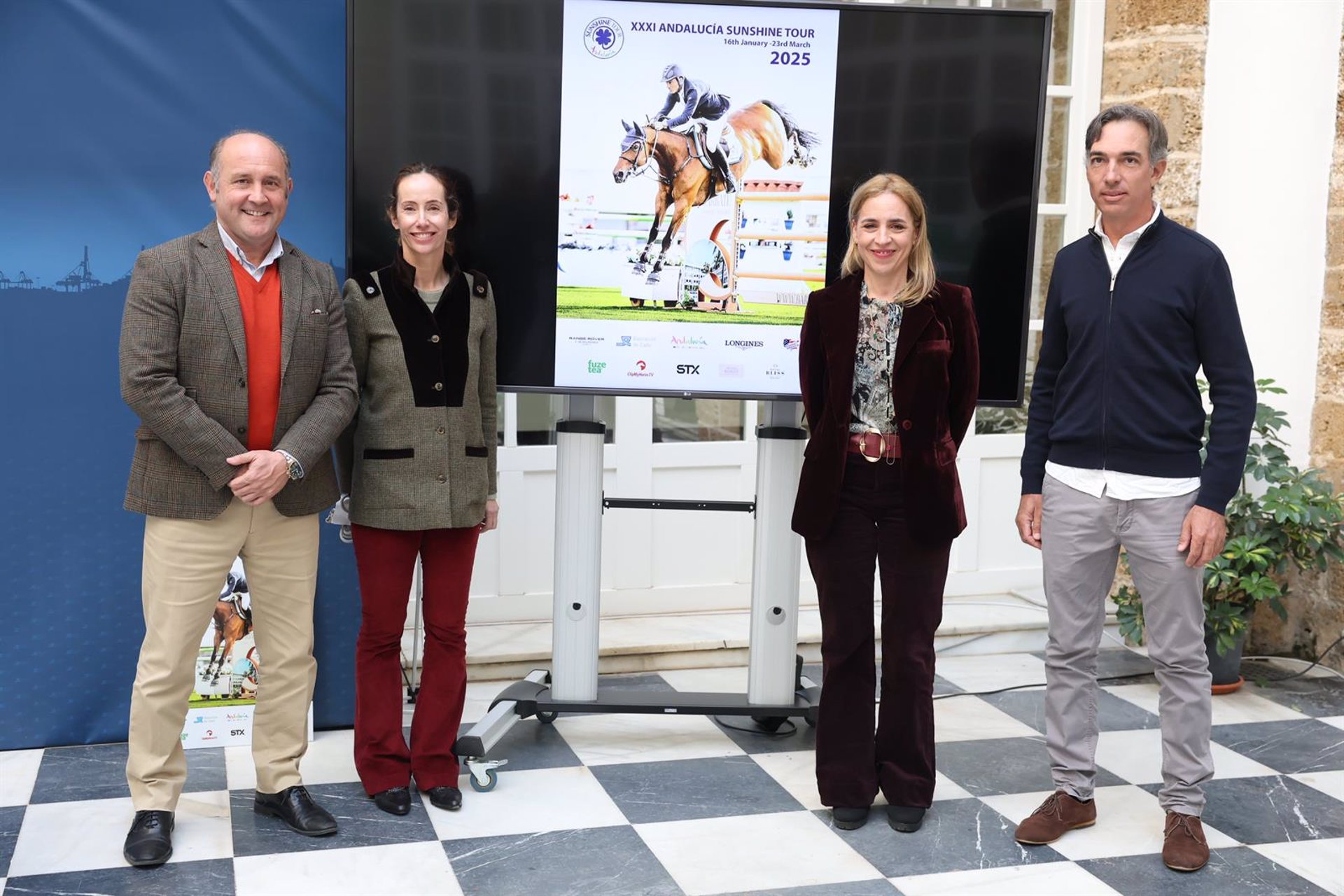 La presidenta de la Diputación de Cádiz, Almudena Martínez, el vicepresidente primero, Juancho Ortiz, la directora del Andalucía Sunshine Tour, Teresa Blázquez, y el jinete Armando Trapote, han presentado la XXXI edición del Circuito Hípico del Sol, Sunshine Tour, que inaugura el calendario de grandes eventos en la provincia y cuenta con ua previsión de un impacto económico de 60 millones.