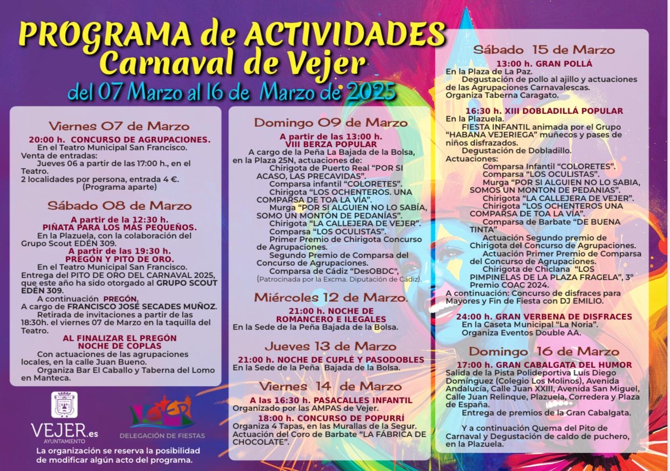 A lo largo de dos semanas, las agrupaciones sonarán por peñas y distintos lugares dando protagonismo al Carnaval en Vejer, que finalizará el domingo 16 de marzo con la Gran Cabalgata del Humor.