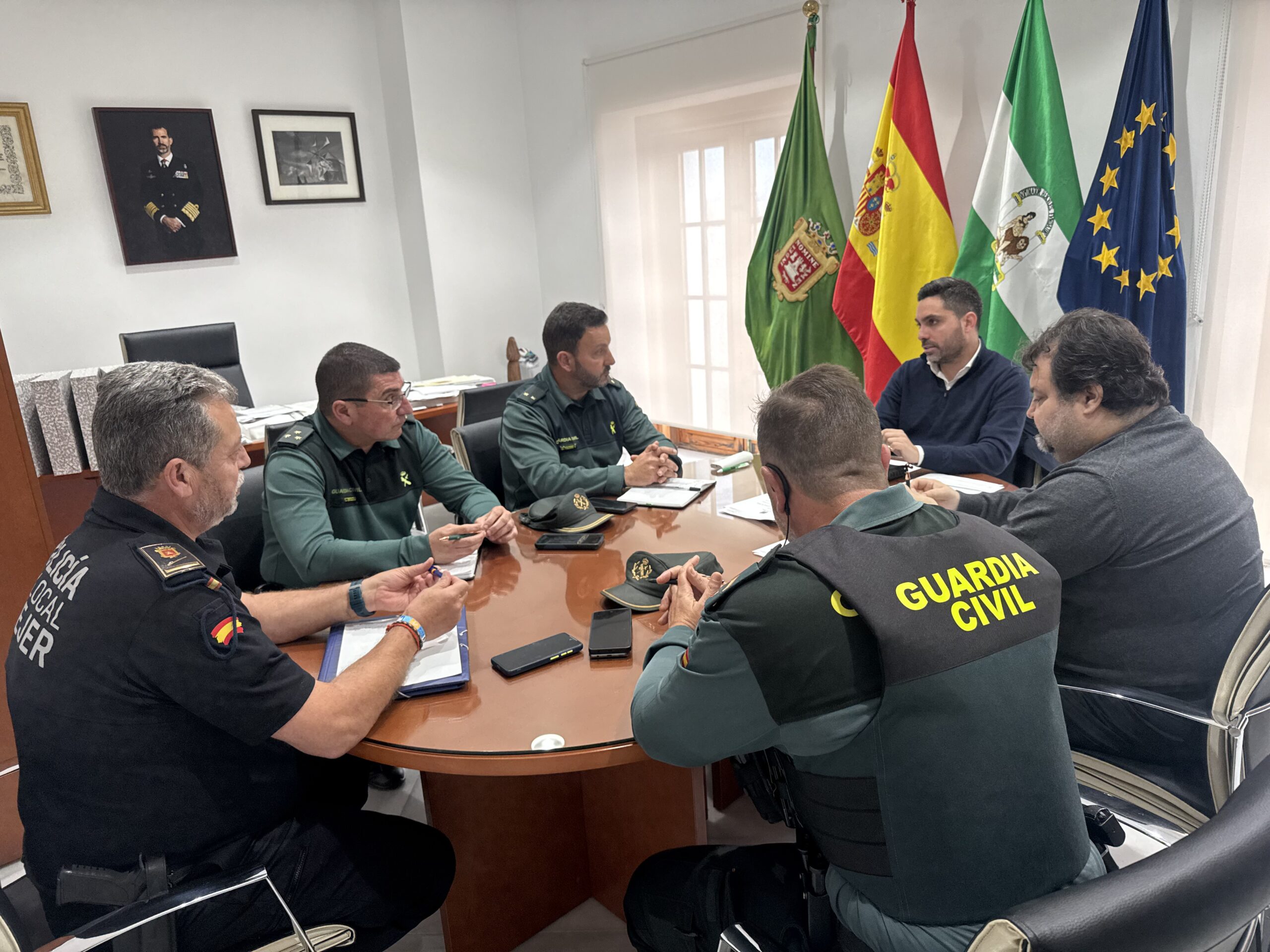 El alcalde de Vejer, Antonio González, ha presidido una reunión de coordinación en la que han participado el concejal de Seguridad, Francisco Javier González; el jefe de la Policía Local, Bartolomé Vallejo, así como el capitán de la Guardia Civil, Raúl Lozano, y el teniente Miguel Ángel Cordón, con el objetivo de planificar actuaciones conjuntas de cara a la próxima Semana Santa y la temporada estival.