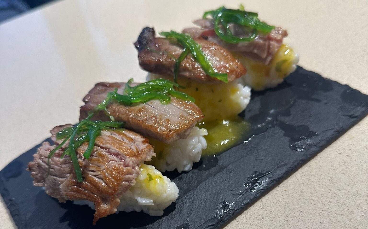 Además, el bar también se suma con entusiasmo a eventos gastronómicos como la Ruta del Atún de Conil, en cuya edición número 28 han sorprendido con una propuesta creativa e innovadora: nigiris con reducción de melocotón y menta cubiertos de atún rojo marcado (que presentaron en la muestra el pasado fin de semana), tataki marinado con salsa ponzu, tostas con salmorejo y wakame, y un tartar sobre crujiente de almendras aliñadas. Todos estos platos están elaborados con atún rojo de almadraba y disponibles en una carta especial durante el evento hasta el 9 de junio.