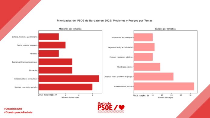 Entre las mociones más relevantes presentadas durante 2025 destacan las relacionadas con la financiación local, la defensa de la sanidad pública (Hospital de La Janda, atención sociosanitaria, dependencia y programas de detección precoz), la educación pública (universalización de 0 a 3 años, mejoras en centros educativos y atención al alumnado con TEA), la vivienda social, el dragado del puerto, la mejora de infraestructuras viarias, el carril bici Barbate-Zahara, la protección del sector pesquero y la memoria democrática.